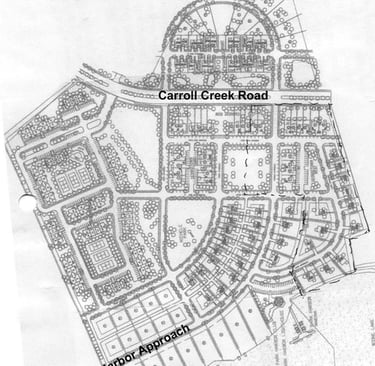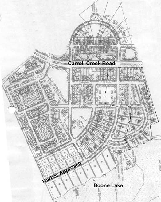 The development of the 10 properties on Lake Approach and on Harbor Approach south of Georgetown Row as well as all the property south of Georgetown Row and west of Harbor Approach started in December 2004 with the sale of those properties to Gary and Karla Philips. Philips significantly lowered the housing density from the concept plan in the earlier figure thereby raising the housing values of the development.